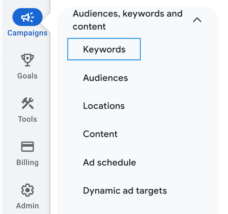 - To do this, click into your Performance Max campaign and then on the left navigation bar, click Campaigns > Audiences, Keywords and Content > Keywords.