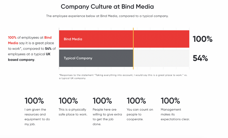 ‘100% of employees at Bind Media say it is a great place to work, compared to 54% of employees at a typical UK company. Source: Great Place to Work™ survey.’